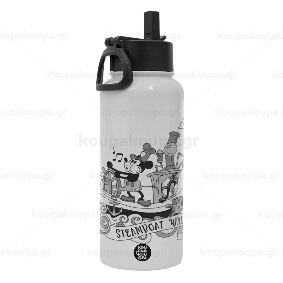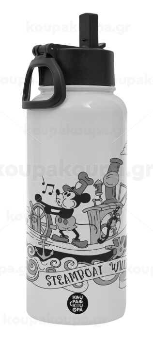 Mickey steamboat, Μεταλλικό παγούρι θερμός Λευκό με καλαμάκι και χερούλι (Stainless steel), διπλού τοιχώματος, 950ml