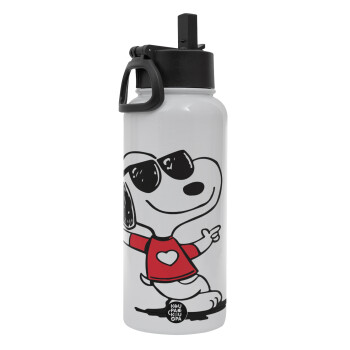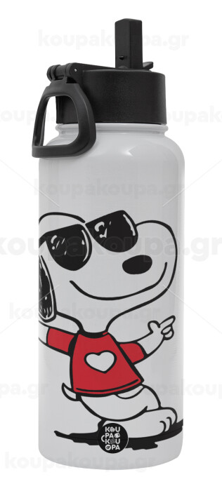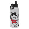 Snoopy καρδούλα, Μεταλλικό παγούρι θερμός Λευκό με καλαμάκι και χερούλι (Stainless steel), διπλού τοιχώματος, 950ml