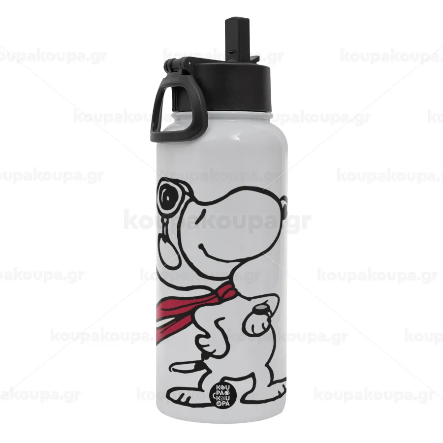 Snoopy ο πιλότος, Μεταλλικό παγούρι θερμός Λευκό με καλαμάκι και χερούλι (Stainless steel), διπλού τοιχώματος, 950ml