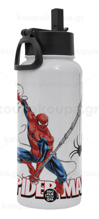 Spiderman fly, Μεταλλικό παγούρι θερμός Λευκό με καλαμάκι και χερούλι (Stainless steel), διπλού τοιχώματος, 950ml