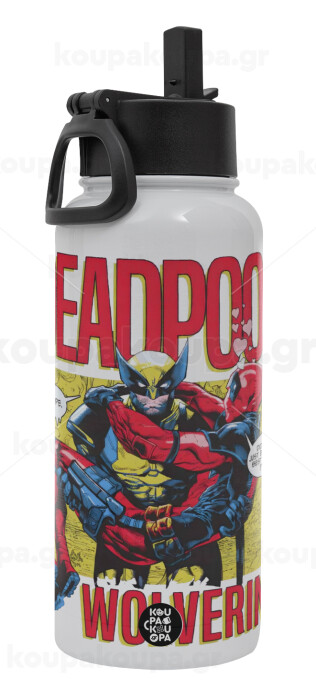Superhero Deadpool Wolverine, Μεταλλικό παγούρι θερμός Λευκό με καλαμάκι και χερούλι (Stainless steel), διπλού τοιχώματος, 950ml