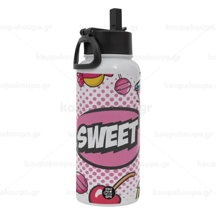 SWEET, Μεταλλικό παγούρι θερμός Λευκό με καλαμάκι και χερούλι (Stainless steel), διπλού τοιχώματος, 950ml