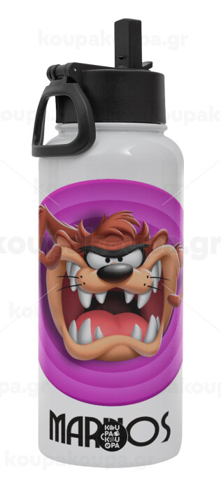 Taz, Μεταλλικό παγούρι θερμός Λευκό με καλαμάκι και χερούλι (Stainless steel), διπλού τοιχώματος, 950ml