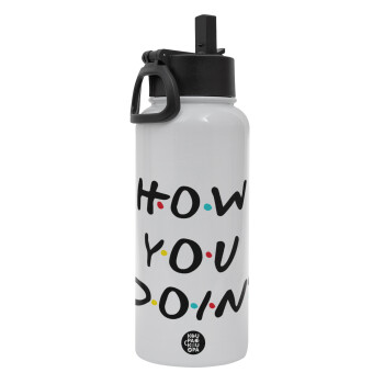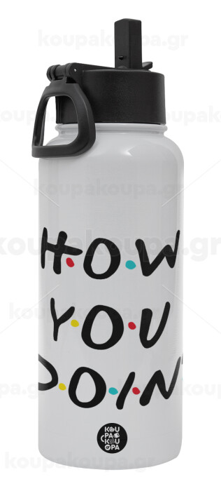 Friends How You Doin'?, Μεταλλικό παγούρι θερμός Λευκό με καλαμάκι και χερούλι (Stainless steel), διπλού τοιχώματος, 950ml