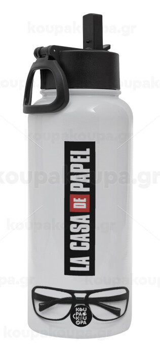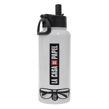 la professor, γυαλιά, Μεταλλικό παγούρι θερμός Λευκό με καλαμάκι και χερούλι (Stainless steel), διπλού τοιχώματος, 950ml
