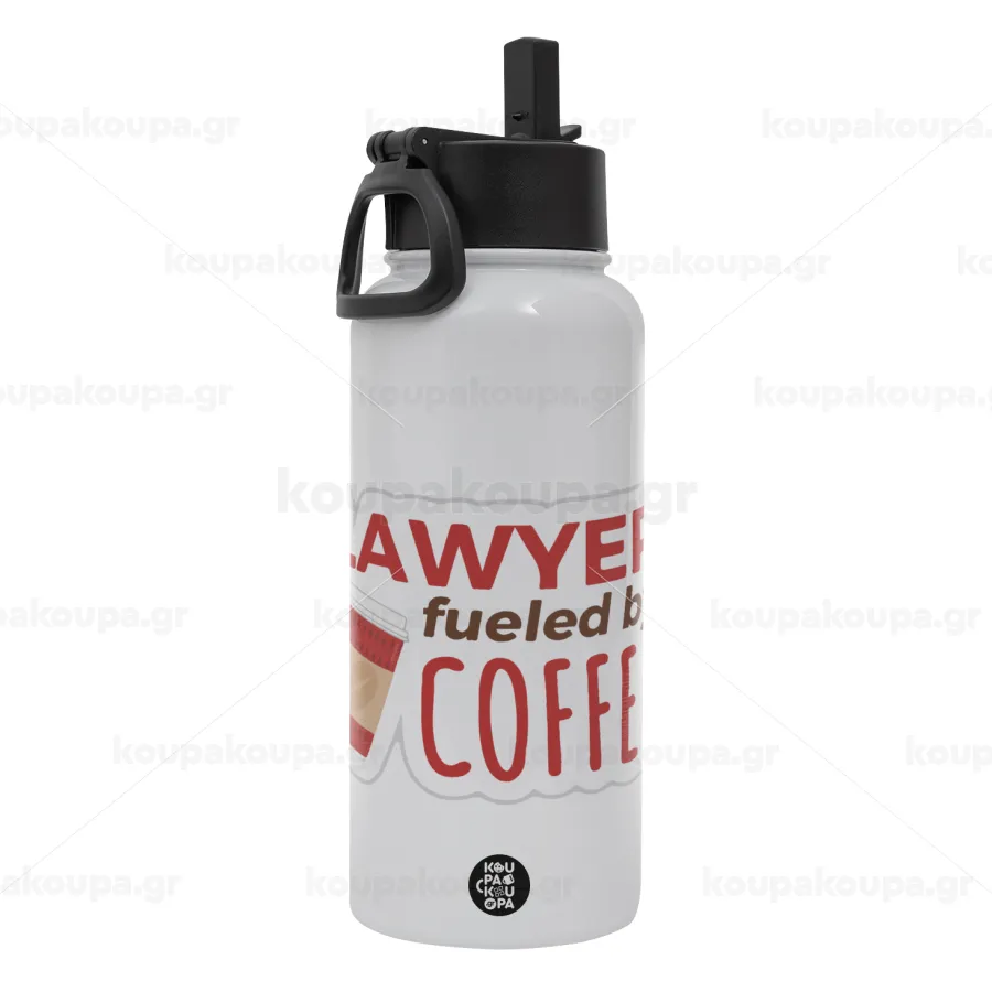 Lawyer fueled by coffee, Μεταλλικό παγούρι θερμός Λευκό με καλαμάκι και χερούλι (Stainless steel), διπλού τοιχώματος, 950ml