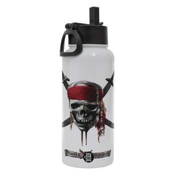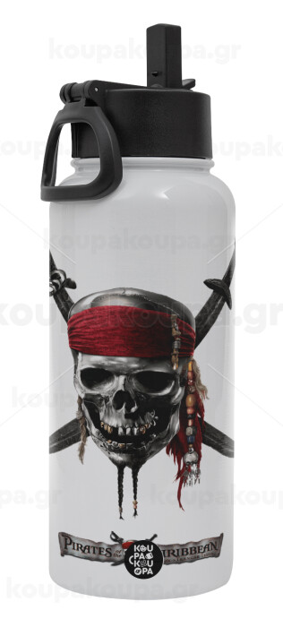 Pirates of the Caribbean, Μεταλλικό παγούρι θερμός Λευκό με καλαμάκι και χερούλι (Stainless steel), διπλού τοιχώματος, 950ml