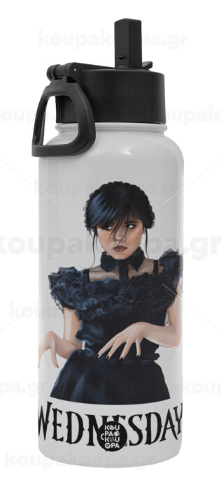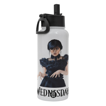 Wednesday Adams, dance with hands, Μεταλλικό παγούρι θερμός Λευκό με καλαμάκι και χερούλι (Stainless steel), διπλού τοιχώματος, 950ml