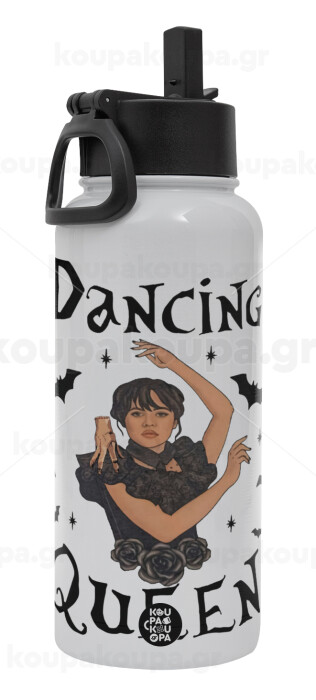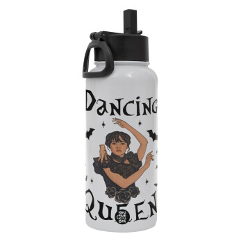Wednesday Addams Dance, Μεταλλικό παγούρι θερμός Λευκό με καλαμάκι και χερούλι (Stainless steel), διπλού τοιχώματος, 950ml