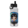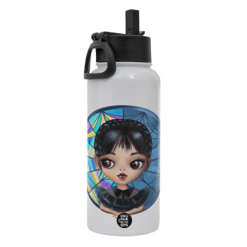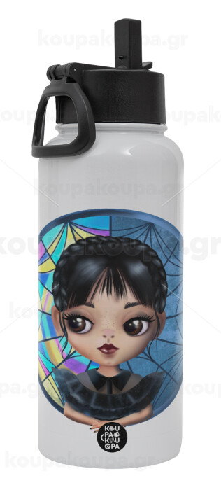 Wednesday big eyes, Μεταλλικό παγούρι θερμός Λευκό με καλαμάκι και χερούλι (Stainless steel), διπλού τοιχώματος, 950ml