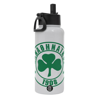 ΠΑΟ Παναθηναϊκός, Μεταλλικό παγούρι θερμός Λευκό με καλαμάκι και χερούλι (Stainless steel), διπλού τοιχώματος, 950ml
