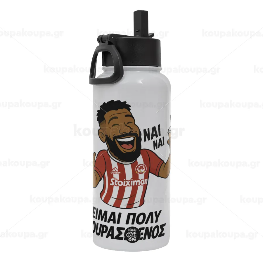 Ροντινέι, "ΠΟΛΥ ΚΟΥΡΑΣΜΕΝΟΣ", Μεταλλικό παγούρι θερμός Λευκό με καλαμάκι και χερούλι (Stainless steel), διπλού τοιχώματος, 950ml
