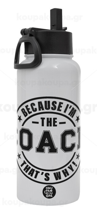 Because i'm the Coach, Μεταλλικό παγούρι θερμός Λευκό με καλαμάκι και χερούλι (Stainless steel), διπλού τοιχώματος, 950ml