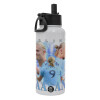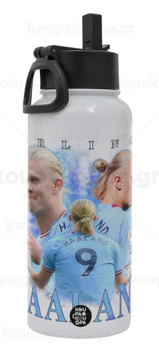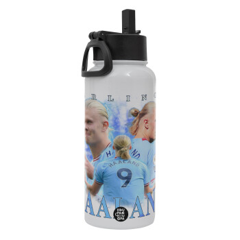 Erling Haaland, Μεταλλικό παγούρι θερμός Λευκό με καλαμάκι και χερούλι (Stainless steel), διπλού τοιχώματος, 950ml