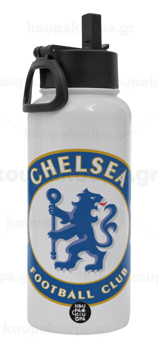 FC Chelsea, Μεταλλικό παγούρι θερμός Λευκό με καλαμάκι και χερούλι (Stainless steel), διπλού τοιχώματος, 950ml