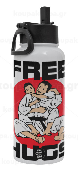 JUDO free hugs, Μεταλλικό παγούρι θερμός Λευκό με καλαμάκι και χερούλι (Stainless steel), διπλού τοιχώματος, 950ml
