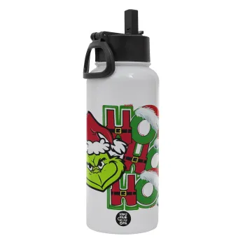 Grinch ho ho ho, Μεταλλικό παγούρι θερμός Λευκό με καλαμάκι και χερούλι (Stainless steel), διπλού τοιχώματος, 950ml