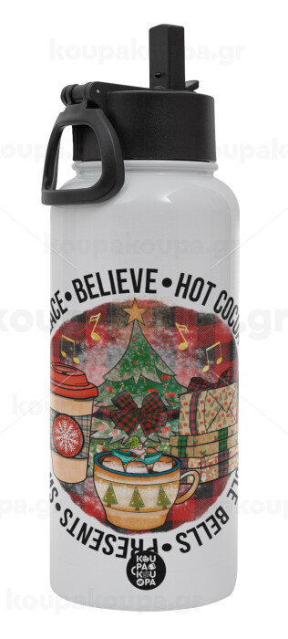 Joy, Peace, Believe, Hot Cocoa, Carols, Μεταλλικό παγούρι θερμός Λευκό με καλαμάκι και χερούλι (Stainless steel), διπλού τοιχώματος, 950ml