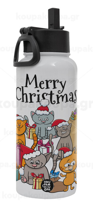 Merry Christmas Cats, Μεταλλικό παγούρι θερμός Λευκό με καλαμάκι και χερούλι (Stainless steel), διπλού τοιχώματος, 950ml