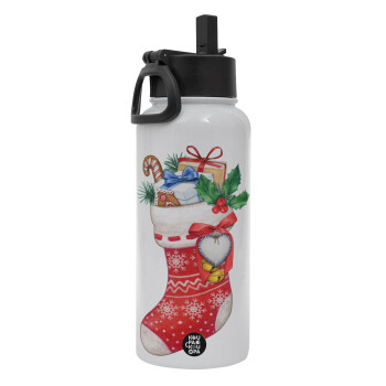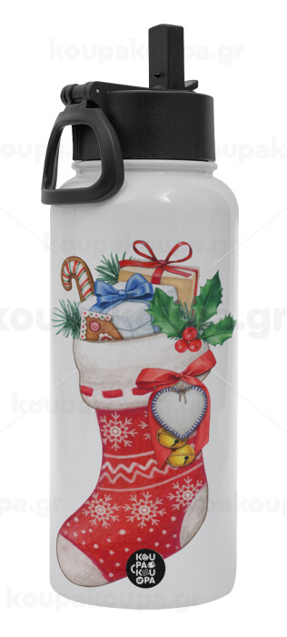 Xmas boot, Μεταλλικό παγούρι θερμός Λευκό με καλαμάκι και χερούλι (Stainless steel), διπλού τοιχώματος, 950ml