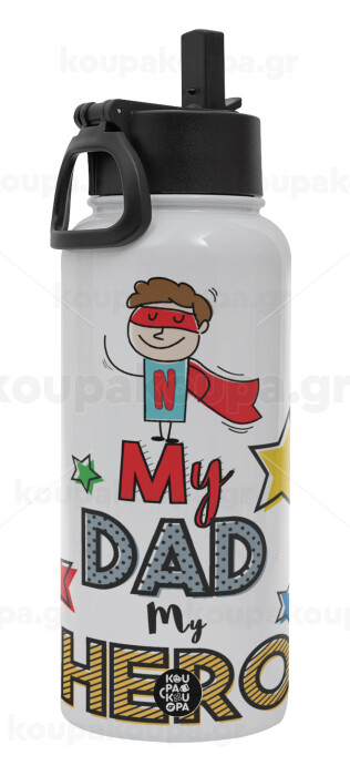 My Dad, my Hero!!!, Μεταλλικό παγούρι θερμός Λευκό με καλαμάκι και χερούλι (Stainless steel), διπλού τοιχώματος, 950ml
