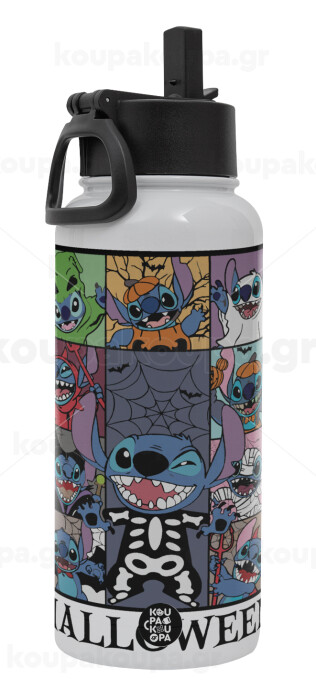 Stitch Halloween, Μεταλλικό παγούρι θερμός Λευκό με καλαμάκι και χερούλι (Stainless steel), διπλού τοιχώματος, 950ml