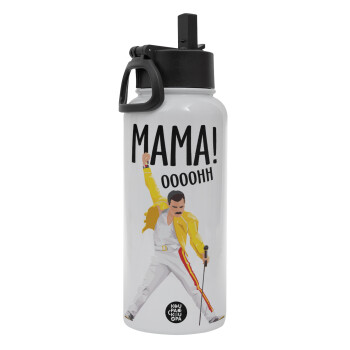 mama ooohh!, Μεταλλικό παγούρι θερμός Λευκό με καλαμάκι και χερούλι (Stainless steel), διπλού τοιχώματος, 950ml