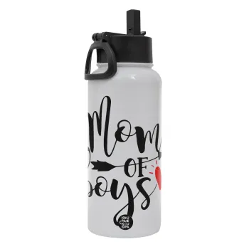 Mom of boys, Μεταλλικό παγούρι θερμός Λευκό με καλαμάκι και χερούλι (Stainless steel), διπλού τοιχώματος, 950ml