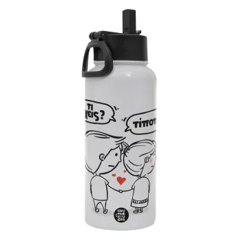 Τι έχεις? Τίποτα!, Μεταλλικό παγούρι θερμός Λευκό με καλαμάκι και χερούλι (Stainless steel), διπλού τοιχώματος, 950ml