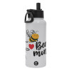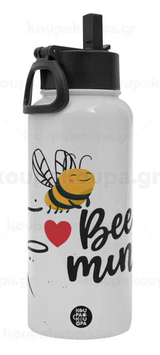 Bee mine!!!, Μεταλλικό παγούρι θερμός Λευκό με καλαμάκι και χερούλι (Stainless steel), διπλού τοιχώματος, 950ml