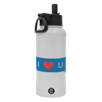 I Love You text message, Μεταλλικό παγούρι θερμός Λευκό με καλαμάκι και χερούλι (Stainless steel), διπλού τοιχώματος, 950ml
