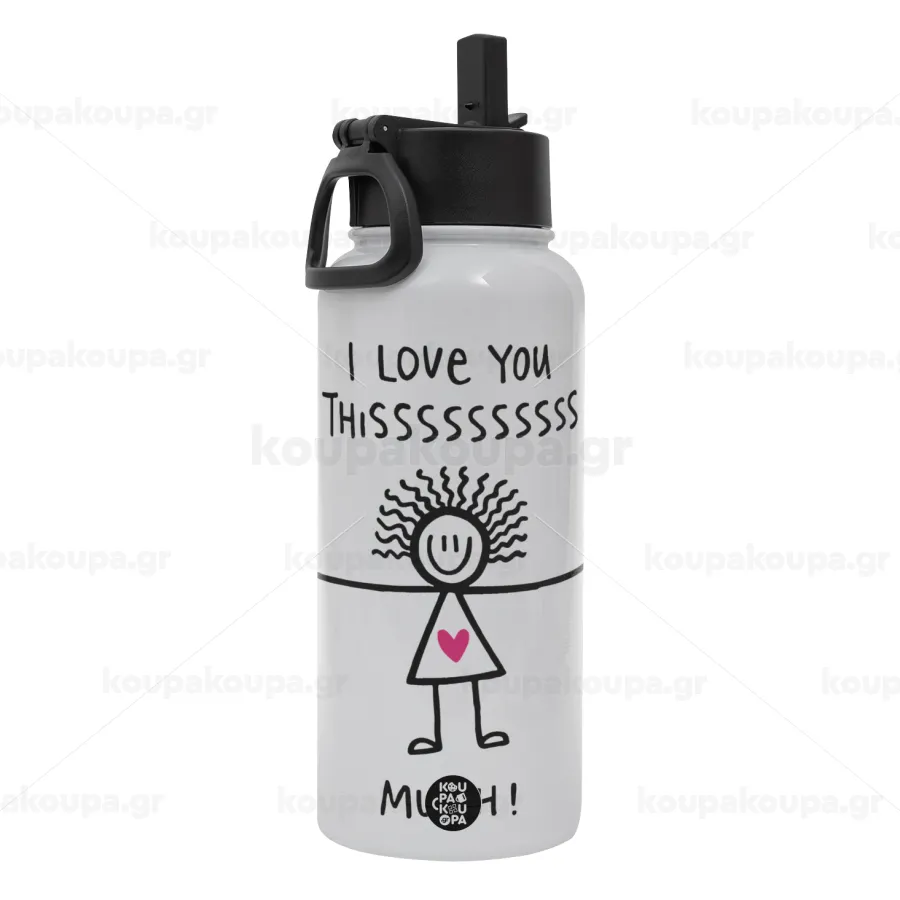 I Love you thissss much..., Μεταλλικό παγούρι θερμός Λευκό με καλαμάκι και χερούλι (Stainless steel), διπλού τοιχώματος, 950ml