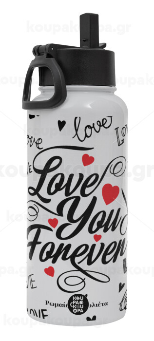 Love You Forever, Μεταλλικό παγούρι θερμός Λευκό με καλαμάκι και χερούλι (Stainless steel), διπλού τοιχώματος, 950ml