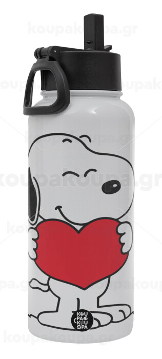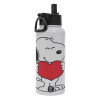 Snoopy takemy heart, Μεταλλικό παγούρι θερμός Λευκό με καλαμάκι και χερούλι (Stainless steel), διπλού τοιχώματος, 950ml