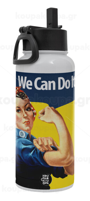 Rosie we can do it!, Μεταλλικό παγούρι θερμός Λευκό με καλαμάκι και χερούλι (Stainless steel), διπλού τοιχώματος, 950ml