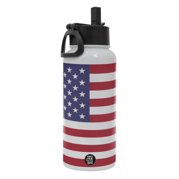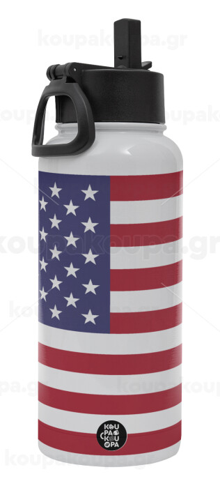 Σημαία Αμερικής, Μεταλλικό παγούρι θερμός Λευκό με καλαμάκι και χερούλι (Stainless steel), διπλού τοιχώματος, 950ml