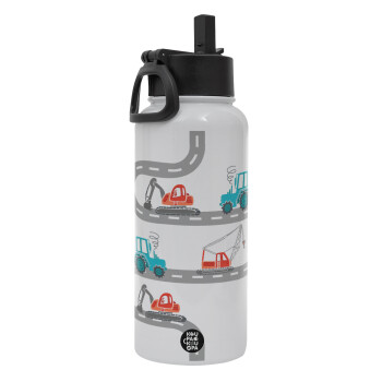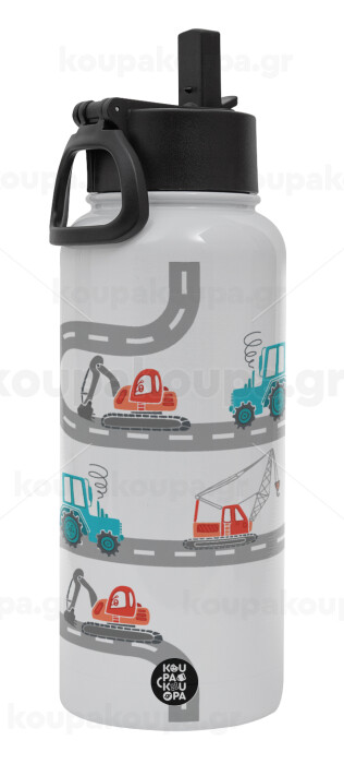 Αμαξάκια στον δρόμο, Μεταλλικό παγούρι θερμός Λευκό με καλαμάκι και χερούλι (Stainless steel), διπλού τοιχώματος, 950ml