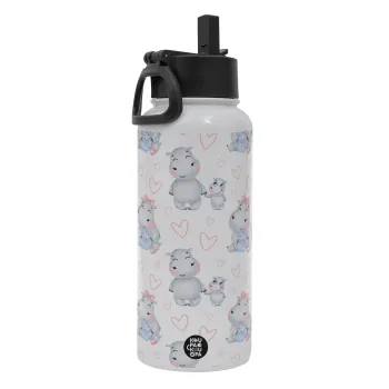Ιπποπόταμος, Μεταλλικό παγούρι θερμός Λευκό με καλαμάκι και χερούλι (Stainless steel), διπλού τοιχώματος, 950ml