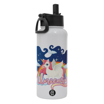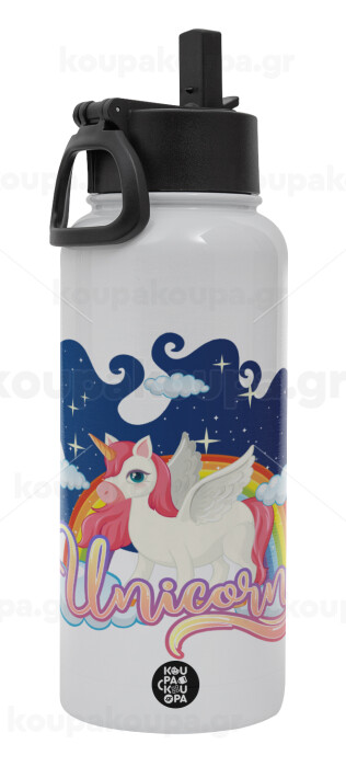 Μονόκερος, Μεταλλικό παγούρι θερμός Λευκό με καλαμάκι και χερούλι (Stainless steel), διπλού τοιχώματος, 950ml