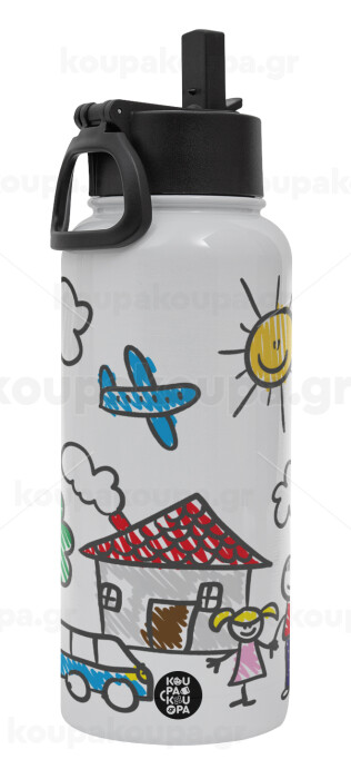Παιδική ζωγραφιά, Μεταλλικό παγούρι θερμός Λευκό με καλαμάκι και χερούλι (Stainless steel), διπλού τοιχώματος, 950ml