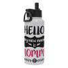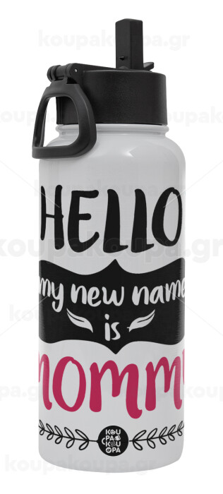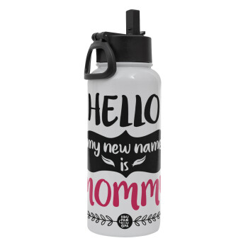 Hello, my new name is Mommy, Μεταλλικό παγούρι θερμός Λευκό με καλαμάκι και χερούλι (Stainless steel), διπλού τοιχώματος, 950ml