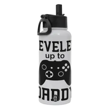 Leveled to Daddy, Μεταλλικό παγούρι θερμός Λευκό με καλαμάκι και χερούλι (Stainless steel), διπλού τοιχώματος, 950ml