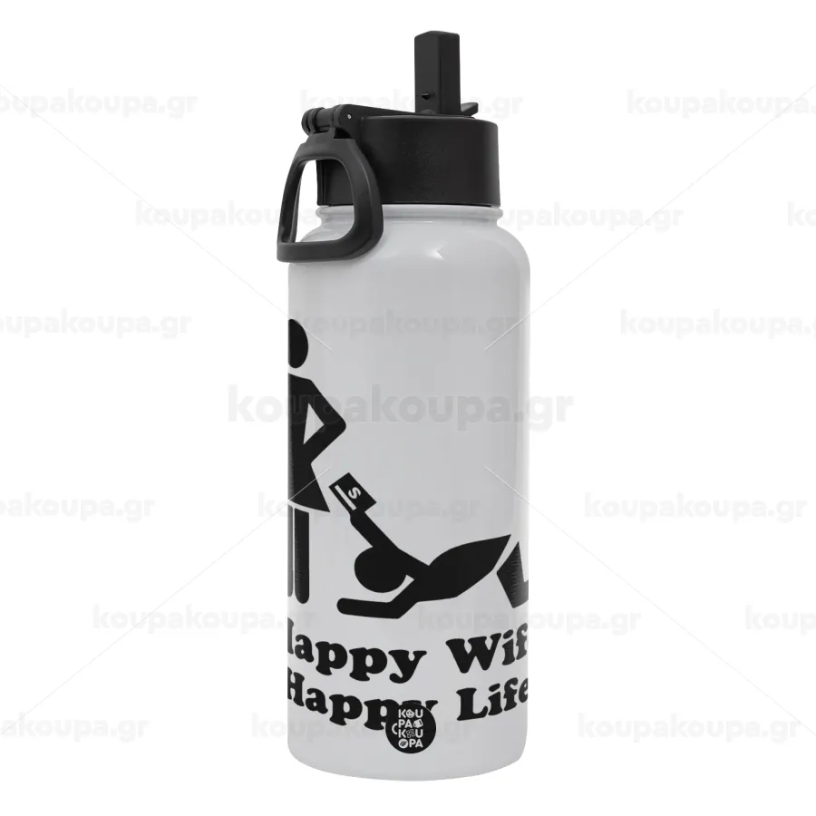 Happy Wife, Happy Life, Μεταλλικό παγούρι θερμός Λευκό με καλαμάκι και χερούλι (Stainless steel), διπλού τοιχώματος, 950ml