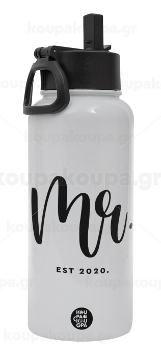 Mr & Mrs (Mr), Μεταλλικό παγούρι θερμός Λευκό με καλαμάκι και χερούλι (Stainless steel), διπλού τοιχώματος, 950ml