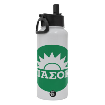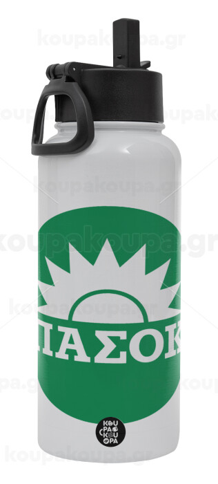 ΠΑΣΟΚ Πράσινο, Μεταλλικό παγούρι θερμός Λευκό με καλαμάκι και χερούλι (Stainless steel), διπλού τοιχώματος, 950ml