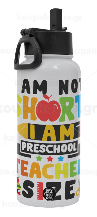 I Am Not Short I Am Preschool Teacher Size, Μεταλλικό παγούρι θερμός Λευκό με καλαμάκι και χερούλι (Stainless steel), διπλού τοιχώματος, 950ml