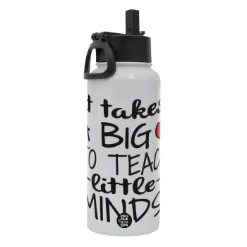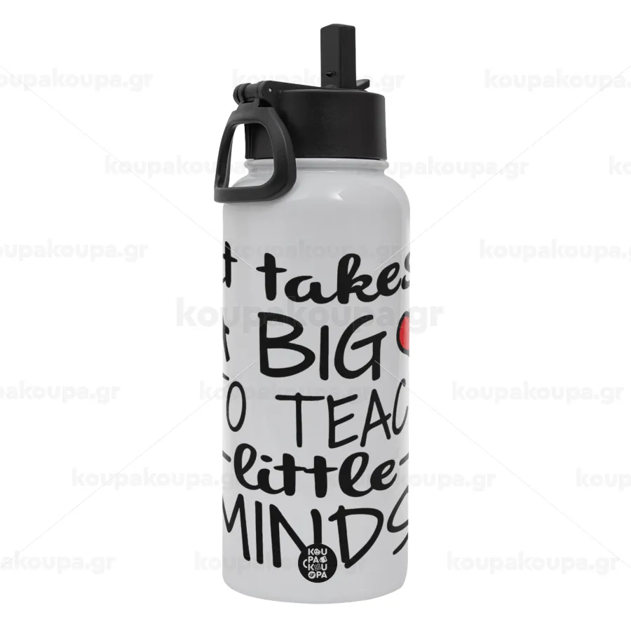 It takes big heart to teach little minds, Μεταλλικό παγούρι θερμός Λευκό με καλαμάκι και χερούλι (Stainless steel), διπλού τοιχώματος, 950ml
