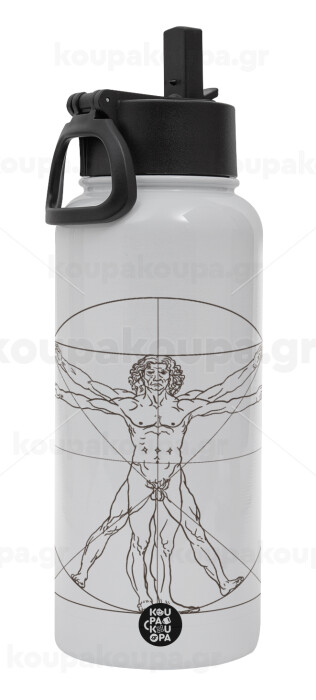 Leonardo da vinci Vitruvian Man, Μεταλλικό παγούρι θερμός Λευκό με καλαμάκι και χερούλι (Stainless steel), διπλού τοιχώματος, 950ml