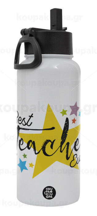 Teacher super star!!!, Μεταλλικό παγούρι θερμός Λευκό με καλαμάκι και χερούλι (Stainless steel), διπλού τοιχώματος, 950ml