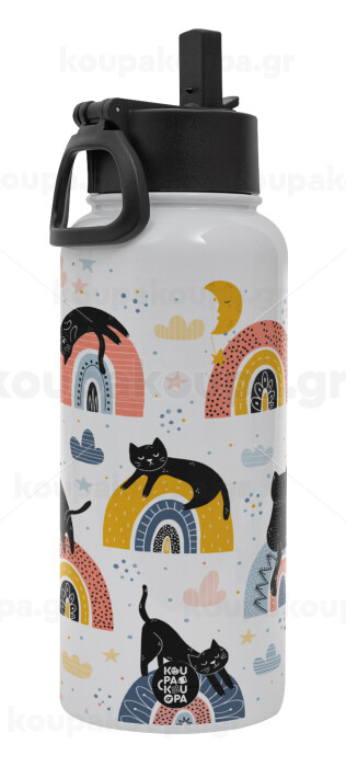 Γατούλες, Μεταλλικό παγούρι θερμός Λευκό με καλαμάκι και χερούλι (Stainless steel), διπλού τοιχώματος, 950ml